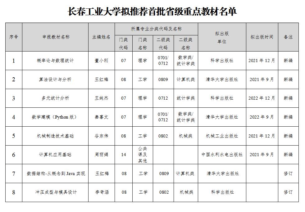依据《吉林省教育厅关于开展首批普通本科高校省级重点教材立项建设工作的通知》(吉教高[2021]11号)的相关要求,经个人申报,学校组织专家组评审,学校决定拟推荐《概率论与数理统计》等8本教材参评吉林省首批重点教材,其中6本为新编教材,2本为修订教材,现将推荐情况进行公示,如有异议,请实名向教务处反映情况。