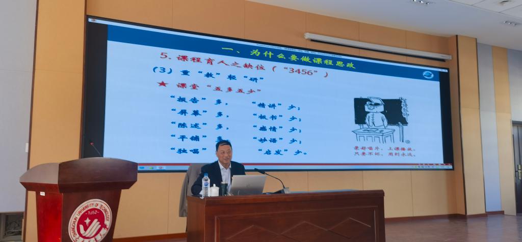 王尧教授以《课程思政——何位,何谓,何为》为题,从为什么要做课程思政、课程思政的内涵与外延、该如何做好课程思政等三个方面进行了深入阐述,重点讲解了贯彻习近平总书记关于课程思政的重要论述精神,围绕课程思政“何谓、何位、何畏、何维、何为”五个问题,对课程思政概念的内涵和外延作了深入阐释,分析了课程思政的重要意义,指出了高校教育教学中存在的“十重十轻”问题,通过建立“十个融合”渠道和具体案例,给出各类课程做好课程思政的方式、方法和建议。