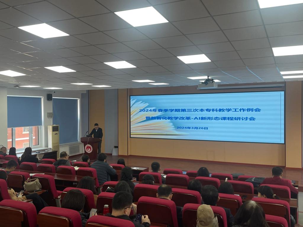 2024年3月26日,学校在综合楼第三阶梯教室召开2024年春季学期第三次本专科教学工作例会暨数智化教学改革-AI新形态课程研讨会。各教学单位教学院长、系(部)主任、教学秘书、专业负责人、课程建设团队教师、骨干教师,教务处、教学质量监控与评价中心、教师教学发展中心工作人员参加了会议。
