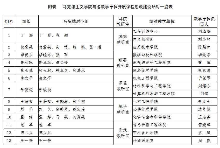 按照教育部《高等学校课程思政建设指导纲要》的要求,经学校研究决定,马克思主义学院成立13个指导组并与各教学单位结对共同开展课程思政建设工作,如附表所示。各教学单位要与结对小组有效开展工作,努力提高本单位课程思政建设工作水平。