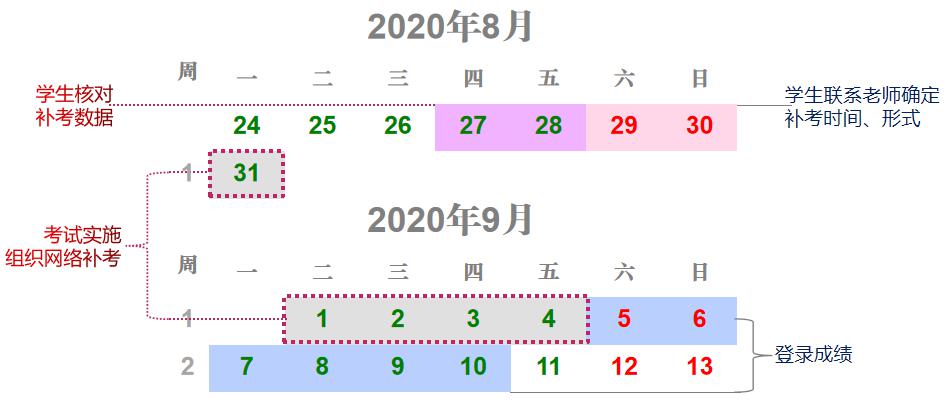 8月31日-9月4日,考试实施,各教学单位根据网络补考实施方案、正式补考名单组织好教师、学生有序进行网络补考。